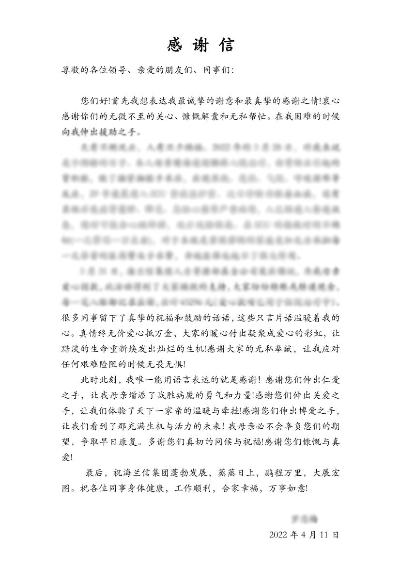 海蘭信集團人力資源部在了解此情況后,迅速在全公司發(fā)出倡議,發(fā)起愛心捐款活動,得到了大家的踴躍支持,大家紛紛轉(zhuǎn)賬或轉(zhuǎn)遞現(xiàn)金,每一筆入賬都記錄在冊,愛心款項很快便用于住院治療中。很多同事還留下了真摯的祝福和鼓勵的話語,只言片語溫暖著海蘭信每一位員工的心。