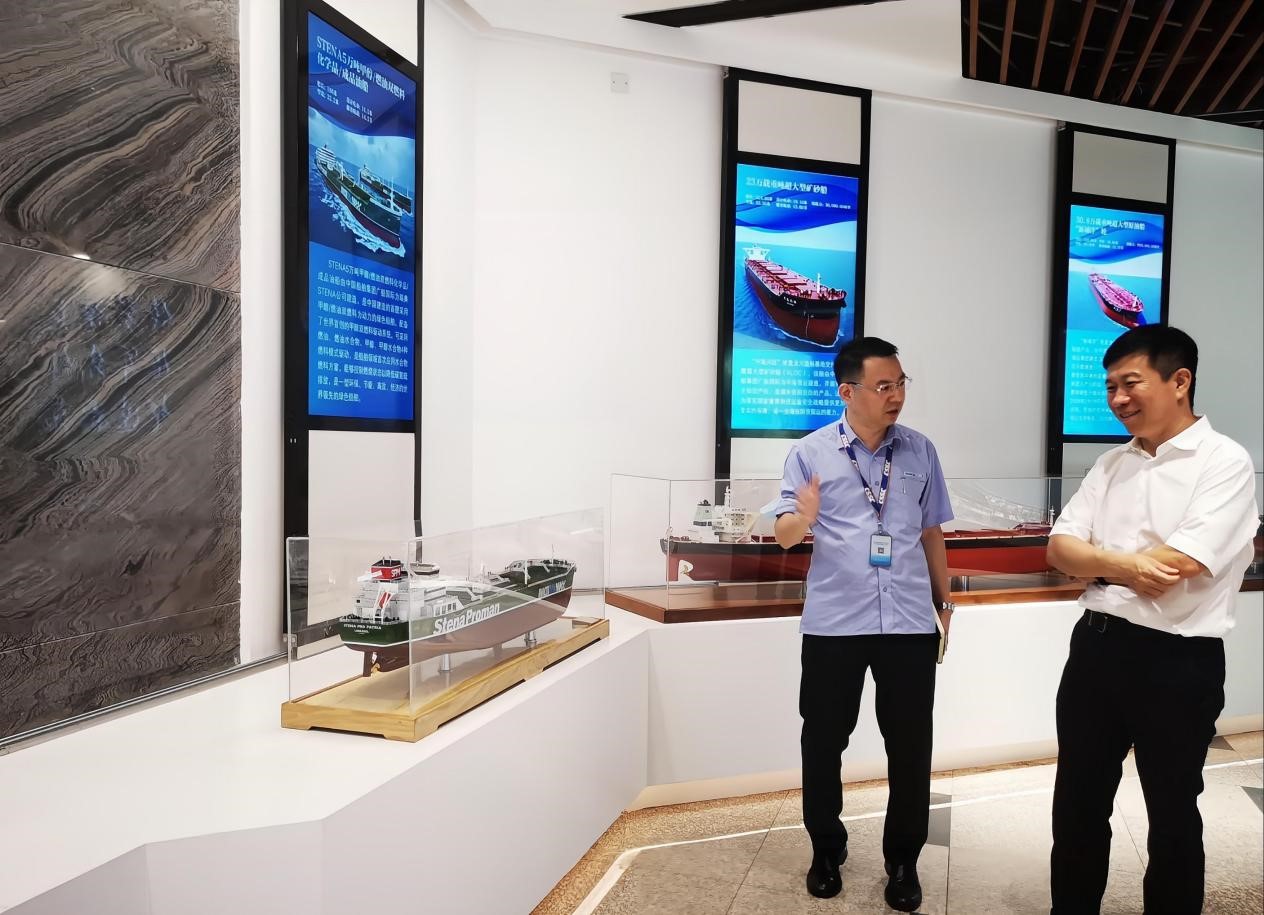 簽約座談會前,由廣船國際副總經(jīng)理周旭輝帶隊參觀公司展館并講解公司發(fā)展歷史。