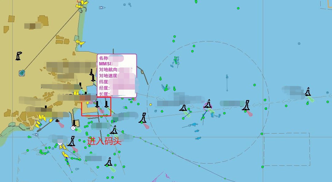 31分鐘之后值班人員報(bào)告:系統(tǒng)提示該船只已經(jīng)進(jìn)入碼頭。請岸上執(zhí)法力量予以配合,具體位置及船只名稱如圖所示。