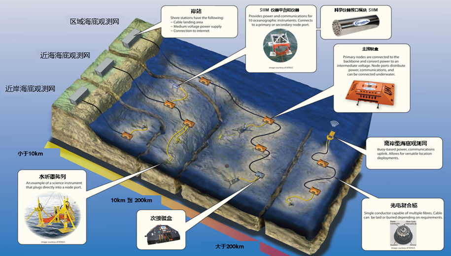 海底觀測網(wǎng)由岸站、主節(jié)點、次節(jié)點、SIIM(海底儀器接口模塊)、科學(xué)儀器設(shè)備和光電纜等組成,利用海底觀測網(wǎng)對特定水域進行長時間、不間斷的多參數(shù)、大范圍監(jiān)測,為軍事應(yīng)用、海洋科學(xué)研究、海上石油天然氣開發(fā),以及其它海洋應(yīng)用提供科學(xué)數(shù)據(jù)支撐。