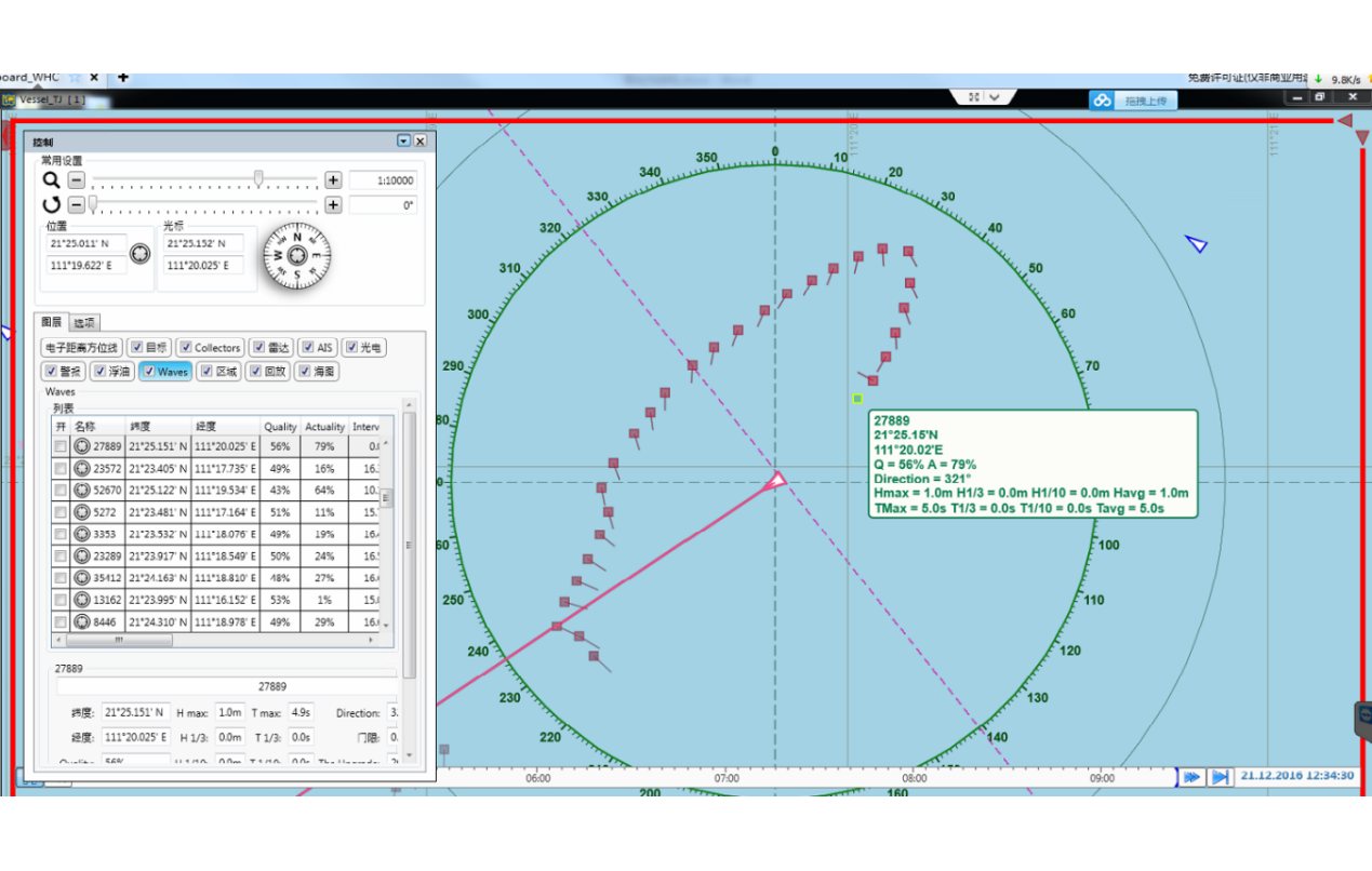 本產(chǎn)品通過(guò)雷達(dá)原始回波信號(hào)對(duì)海面波浪進(jìn)行監(jiān)測(cè),反演附近海域的海浪參數(shù)及海流計(jì)算,生成虛擬浮標(biāo)高度變化曲線,海浪數(shù)據(jù)可進(jìn)行實(shí)時(shí)記錄并可選擇任意時(shí)間點(diǎn)進(jìn)行回放,顯控終端界面可顯示、查詢、統(tǒng)計(jì)歷史海浪參數(shù)數(shù)據(jù)。